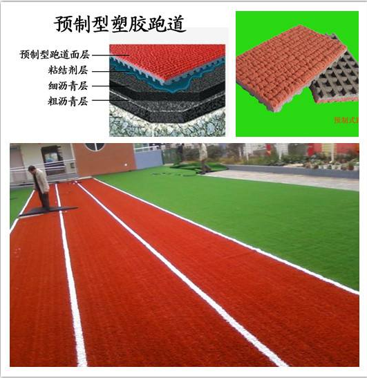預制型塑膠跑道,一種運動地面或跑道,尤其是一種帶有平實型結構的預制型塑膠跑道。它含有摩擦面層、吸震底層和設置在吸震底層與地基之間的膠粘劑層,其特征是:它的吸震底層是一種實心的平實型結構的板材。