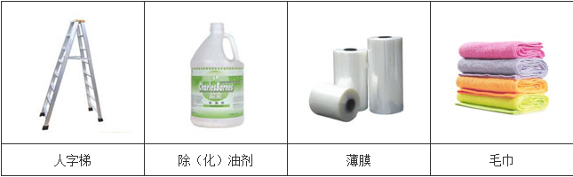 人字梯、除(化)油劑、毛刷、墊布、白潔布、毛巾、薄膜、純棉白手套(薄)。